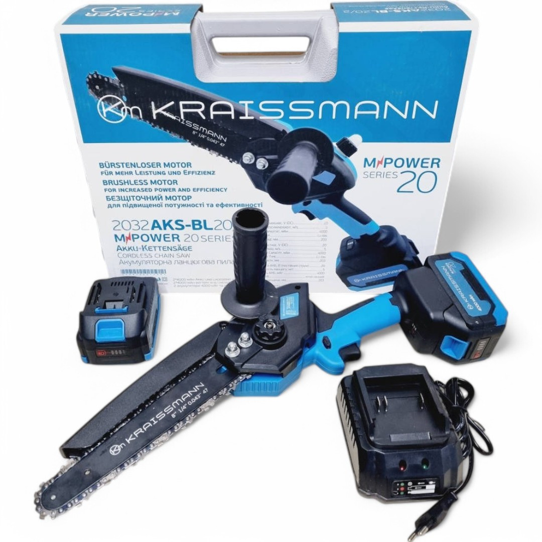 Акумуляторна ланцюгова пилка KRAISSMANN 2032 AKS-BL 20/2 (2 акум. 20В, 4000 мАг, шина 203 мм, НІМЕЧЧИНА)
